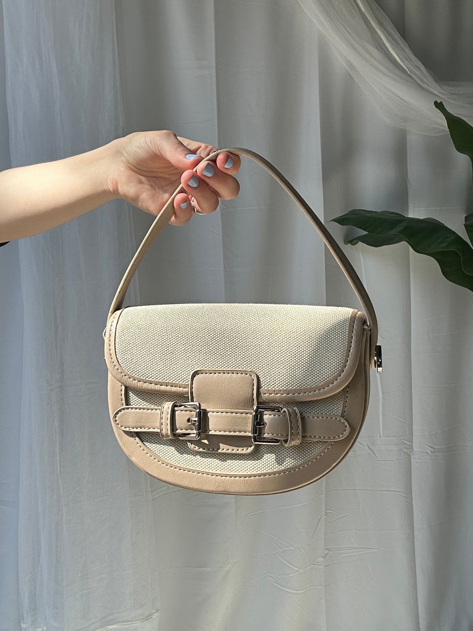 Two toned saddle bag with silver buckle detailing, crossbody strap attachment, and magnet closure.