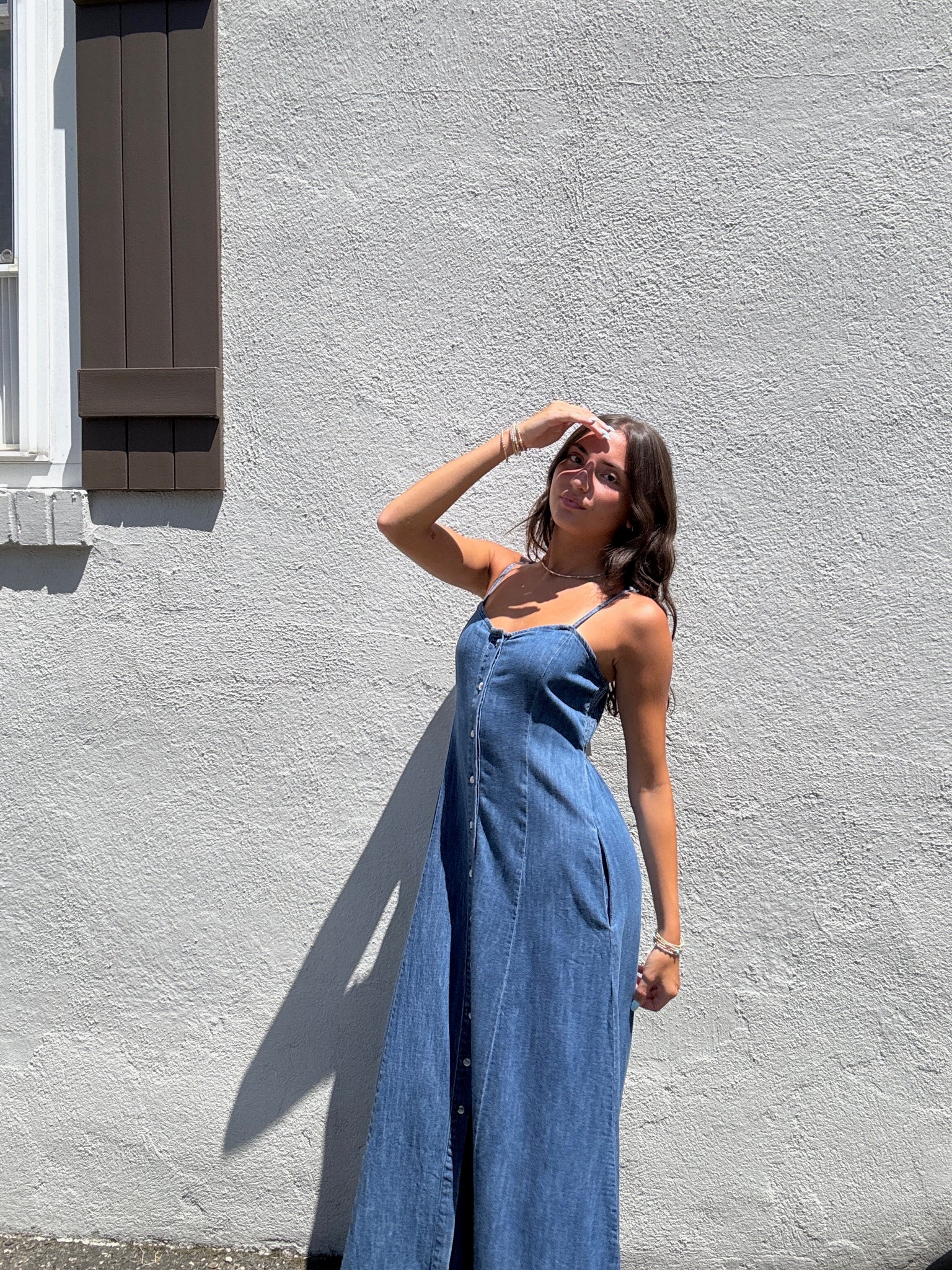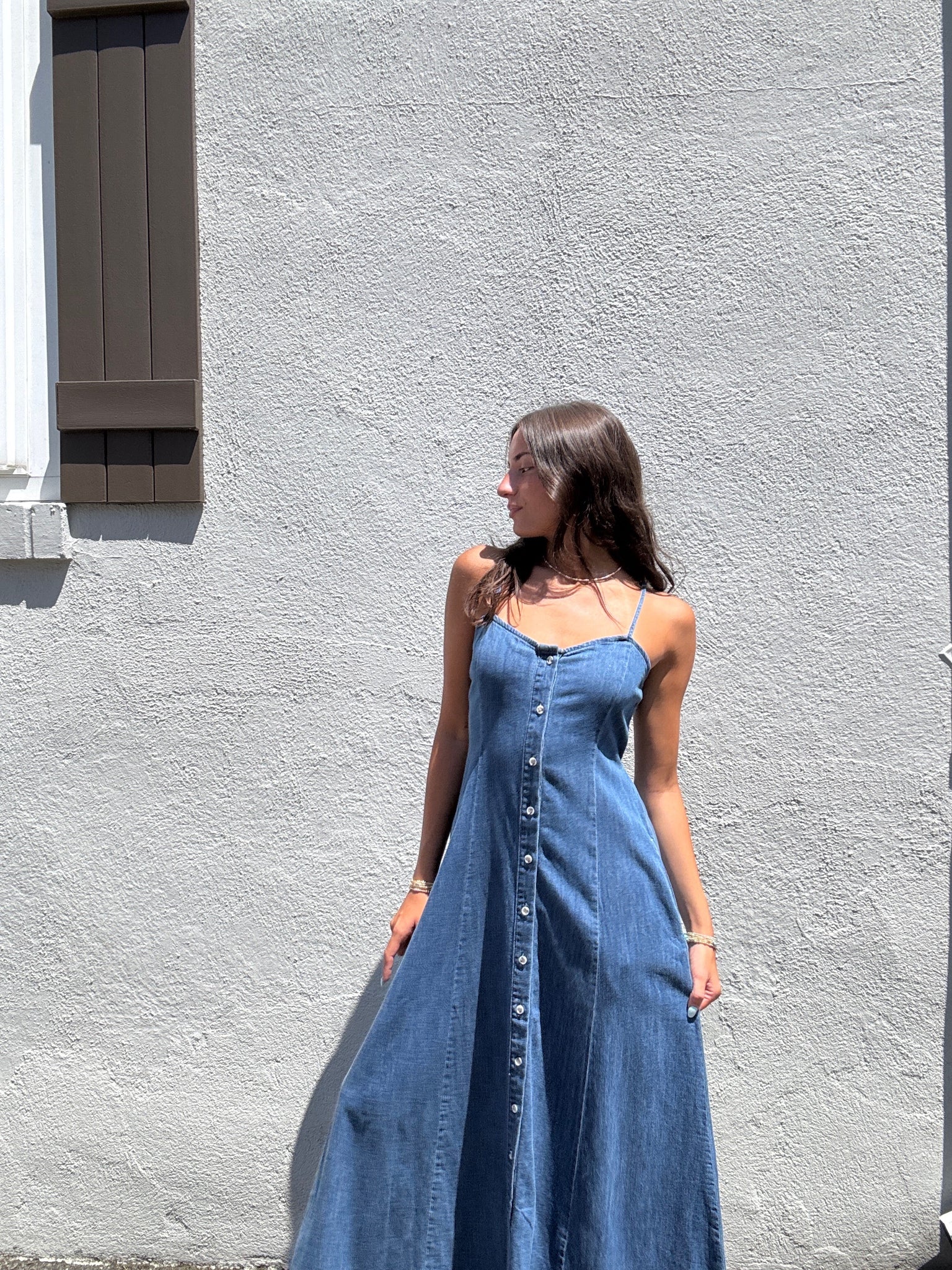 Fitted up top, flowy through the skirt, this midi is equal parts comfy and cute. A full button front, adjustable spaghetti straps, and side pockets keep it super wearable, whether you're dressing it up or keeping things low-key.