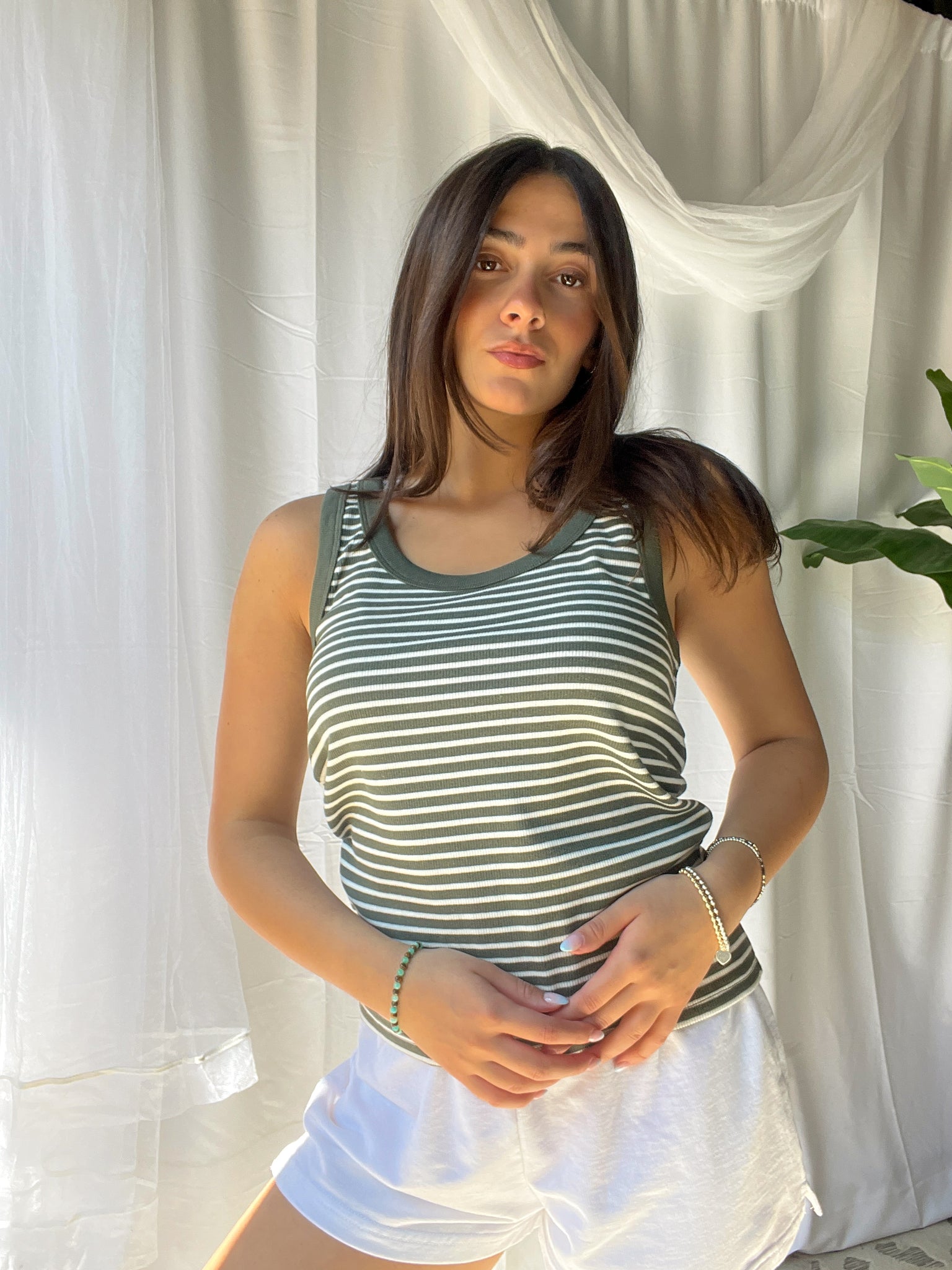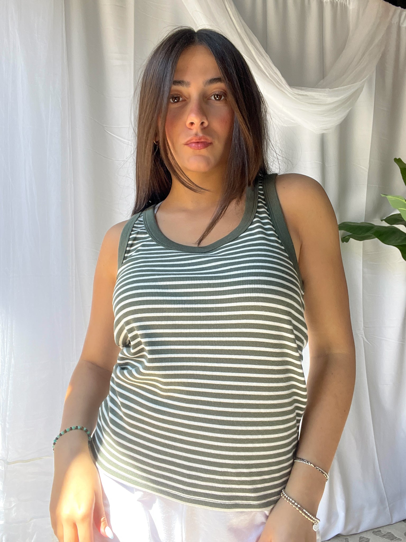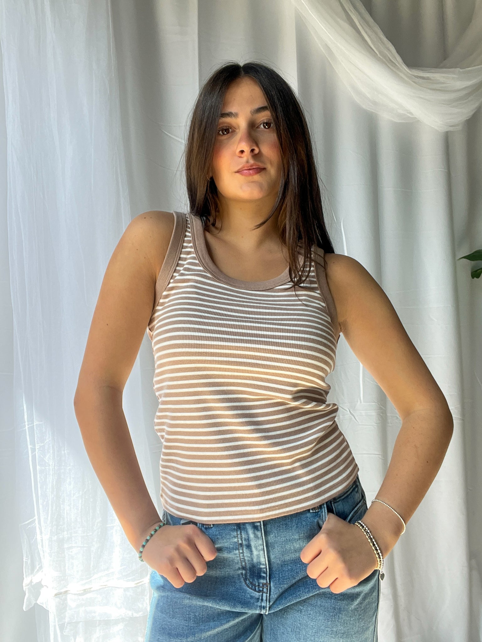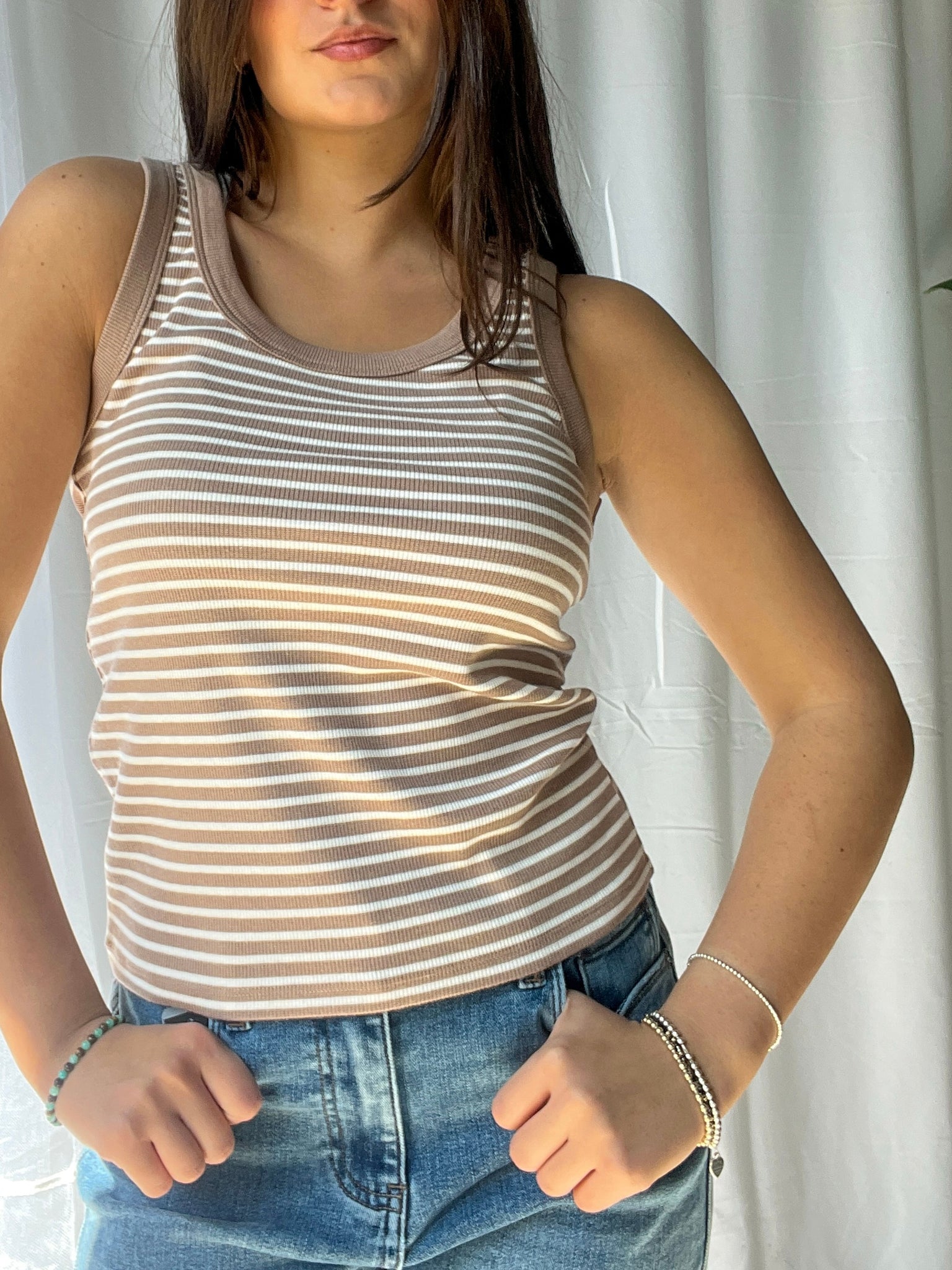 Classic with a twist, this fitted rib tank features a timeless yarn-dyed stripe and a flattering scoop neckline. Made from a comfy cotton-modal blend, it’s bra-friendly, versatile, and perfect for layering or wearing solo.
