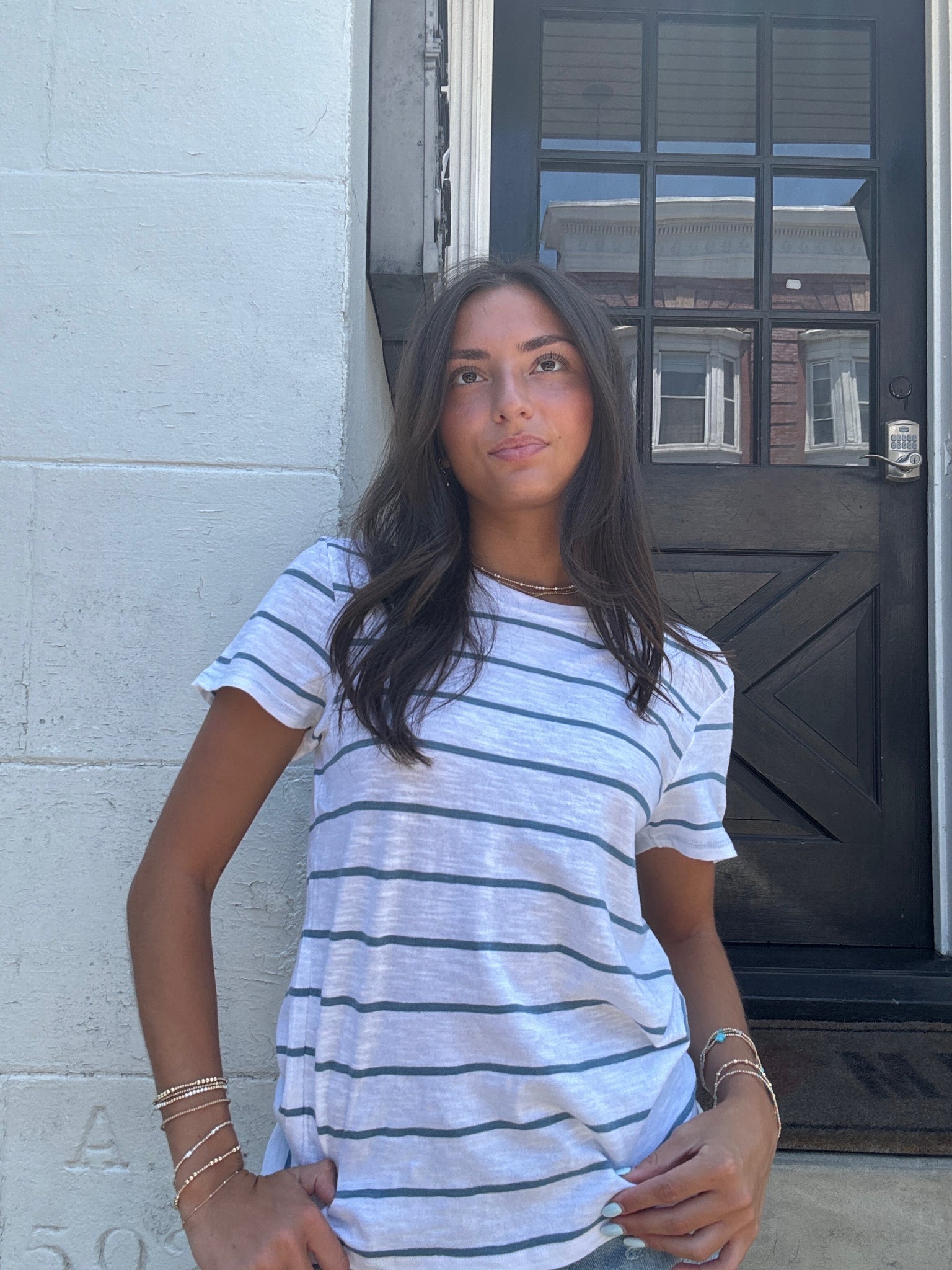 Made from our premium brushed slub jersey, this crew neck tee is soft, lightweight, and endlessly wearable. Classic stripes and a relaxed, tuckable fit make it a go-to for those “what do I wear” days.
